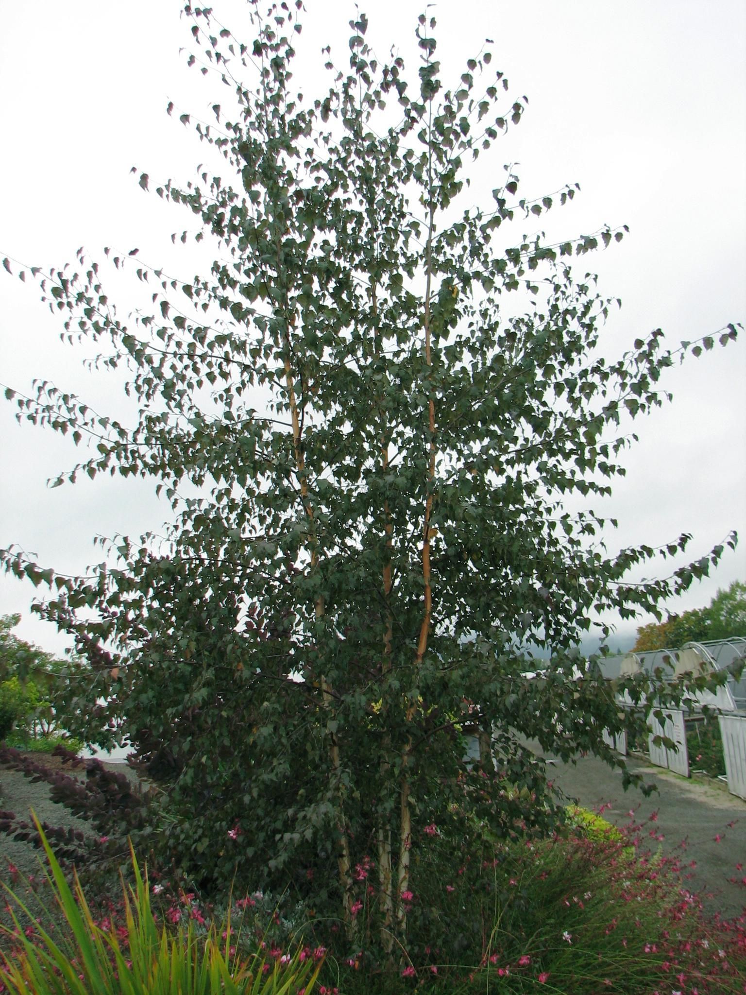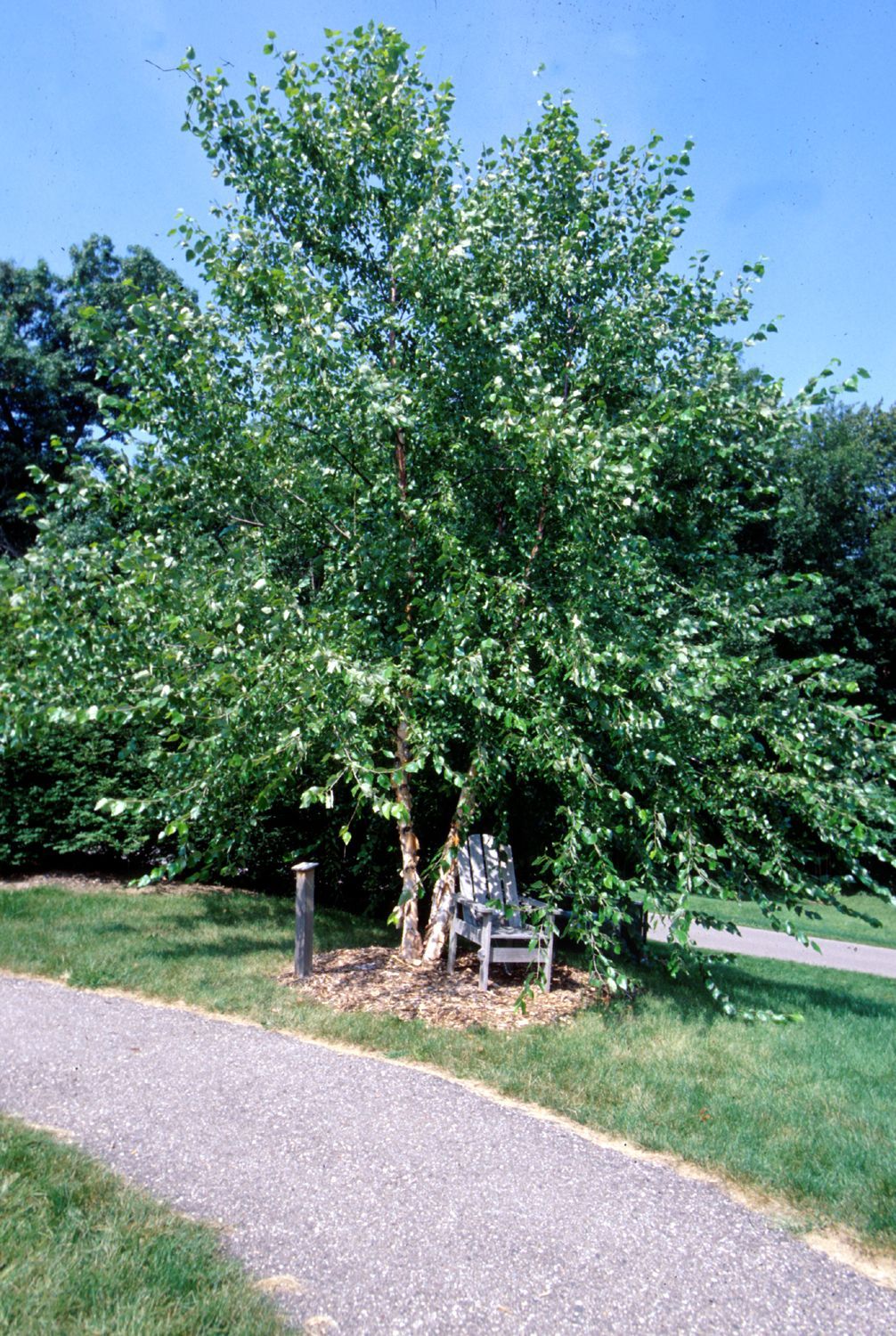 - A white-barked birch with lustrous dark green foliage that changes to yellow in the fall.