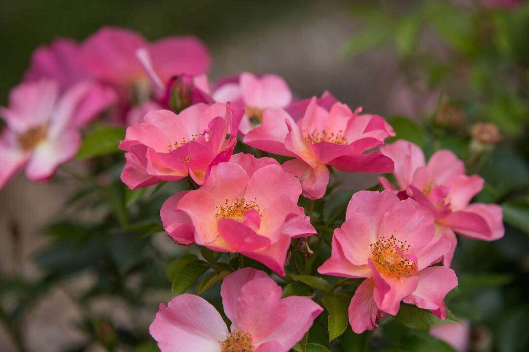 - Blooms of strawberry pink highlighted by stamens of bright yellow.