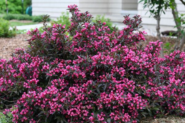 - Compact, upright grower. Abundance of pink flowers with glossy purple foliage.